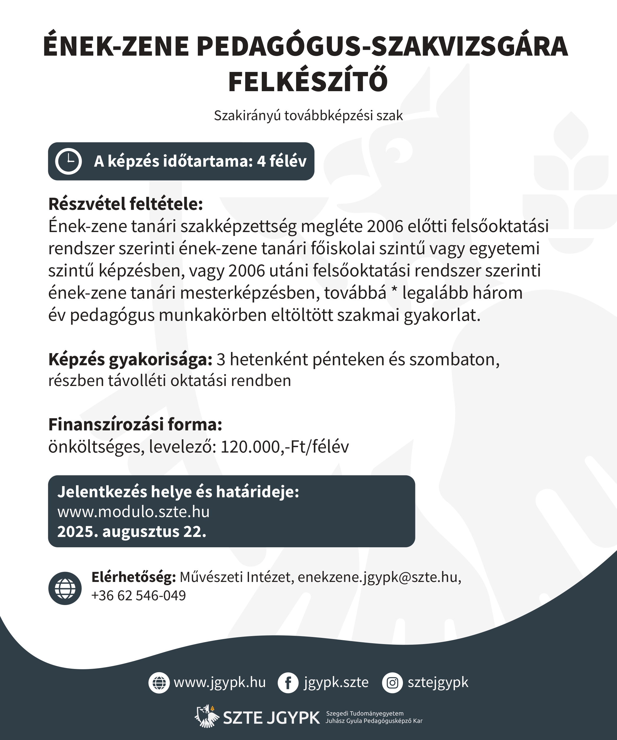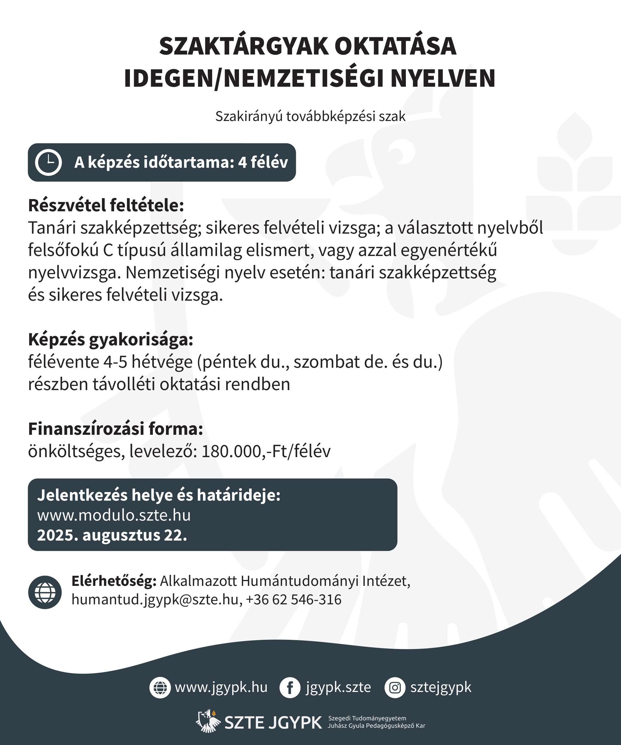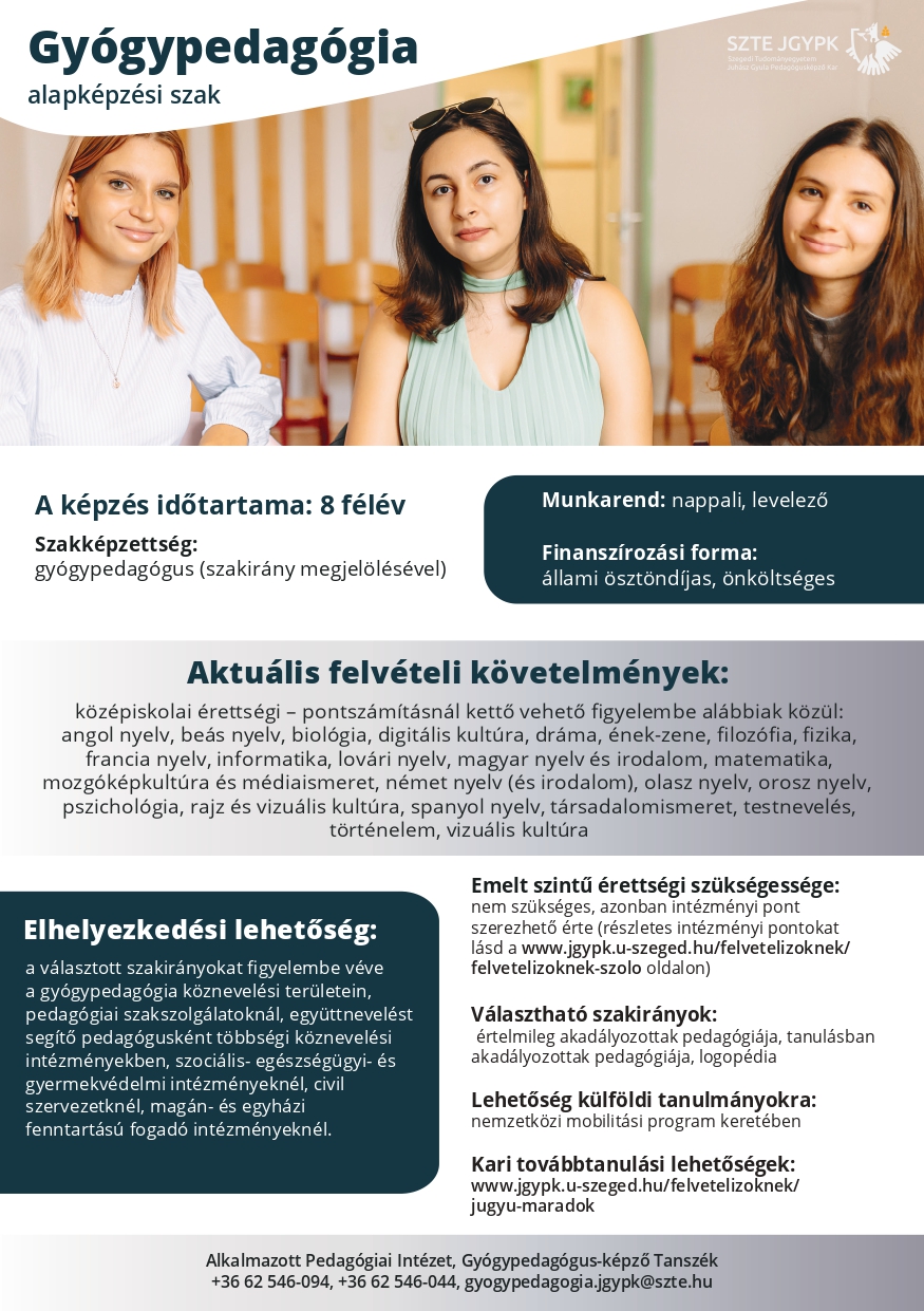 A pedagógusképzés képzési terület mellett a Juhász Gyula Pedagógusképző Kar gazdag és sokszínű, országosan elismert sporttudományi, bölcsészettudományi, társadalomtudományi és művészetközvetítő alap- és mesterképzései, informatikai, műszaki és művészeti felsőoktatási szakképzései, valamint felnőttképzési és szakirányú továbbképzési kínálata is várja Önöket. Hallgatóink olyan szakokon tanulhatnak, amelyek a nyelvi, kulturális vagy kisebbségpolitikai ismeretek elmélyítését éppúgy lehetővé teszik, mint az egészségtudatos életmód, a mentálhigiéné, a sport vagy a közösségi és civil kezdeményezések szakmai támogatását. A művészetek kedvelői otthonra lelhetnek a zene, a vizuális kultúra vagy éppen a filmkészítés világában – ezek a kreatív területek nemcsak esztétikai érzéket fejlesztenek, hanem új nyelvet is adnak a világ értelmezéséhez. Karunk a hazai nemzeti kisebbségek (német, román, szlovák) nyelvének, kultúrájának megőrzésében is aktív szerepet vállal. Amennyiben a nemzetközi munkaerőpiacon is szívesen megmérettetnék magukat, angolnyelvű képzéseinket is figyelmükbe ajánljuk.