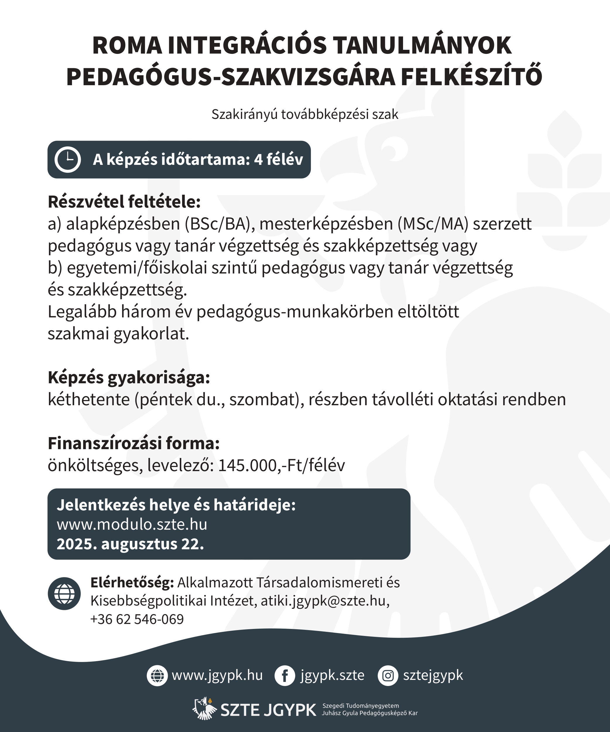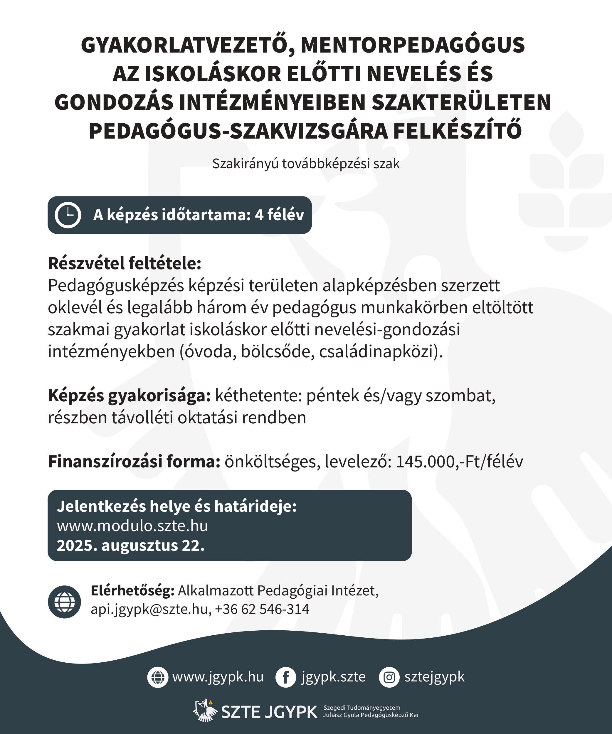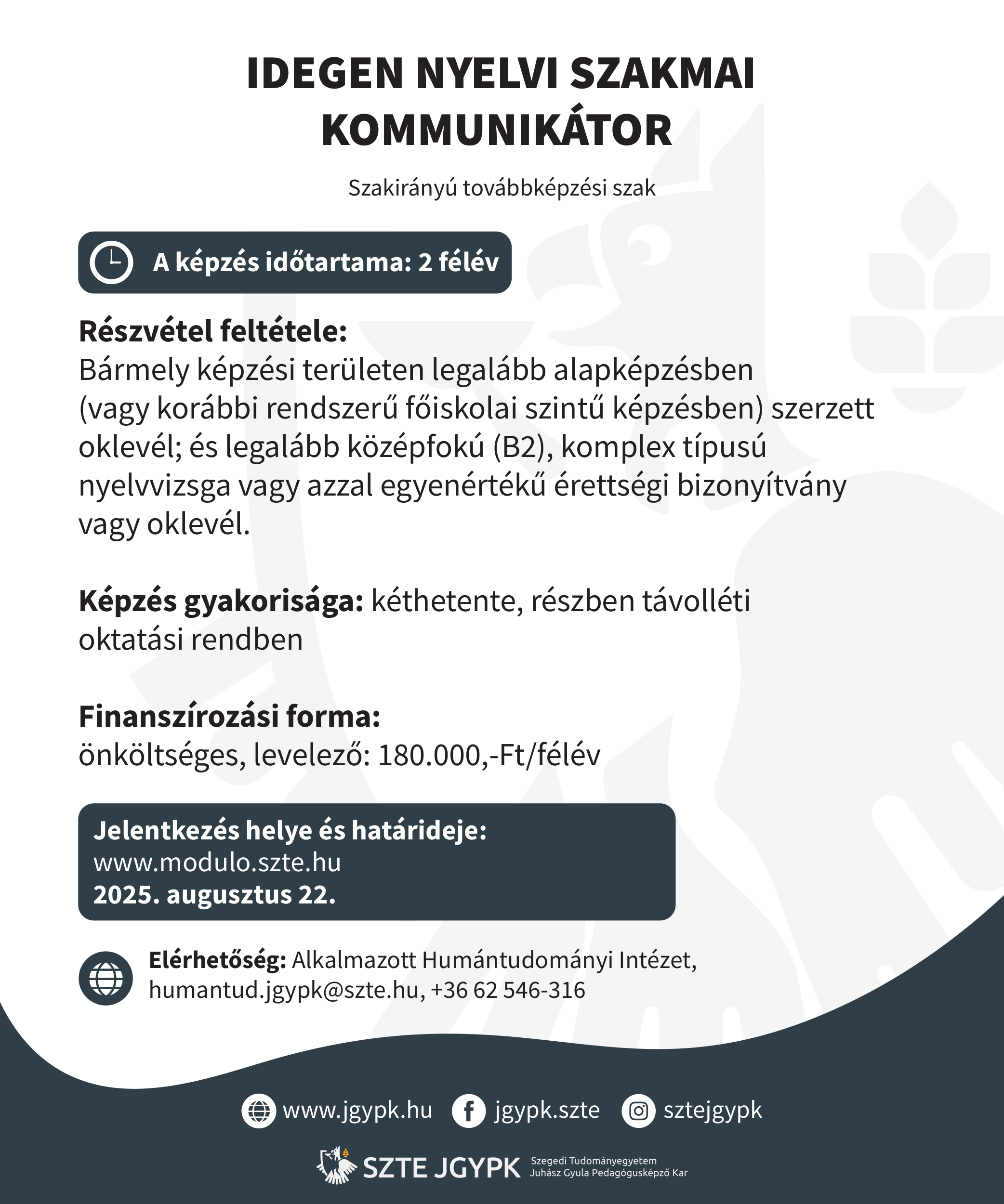A pedagógusképzés képzési terület mellett a Juhász Gyula Pedagógusképző Kar gazdag és sokszínű, országosan elismert sporttudományi, bölcsészettudományi, társadalomtudományi és művészetközvetítő alap- és mesterképzései, informatikai, műszaki és művészeti felsőoktatási szakképzései, valamint felnőttképzési és szakirányú továbbképzési kínálata is várja Önöket. Hallgatóink olyan szakokon tanulhatnak, amelyek a nyelvi, kulturális vagy kisebbségpolitikai ismeretek elmélyítését éppúgy lehetővé teszik, mint az egészségtudatos életmód, a mentálhigiéné, a sport vagy a közösségi és civil kezdeményezések szakmai támogatását. A művészetek kedvelői otthonra lelhetnek a zene, a vizuális kultúra vagy éppen a filmkészítés világában – ezek a kreatív területek nemcsak esztétikai érzéket fejlesztenek, hanem új nyelvet is adnak a világ értelmezéséhez. Karunk a hazai nemzeti kisebbségek (német, román, szlovák) nyelvének, kultúrájának megőrzésében is aktív szerepet vállal. Amennyiben a nemzetközi munkaerőpiacon is szívesen megmérettetnék magukat, angolnyelvű képzéseinket is figyelmükbe ajánljuk.