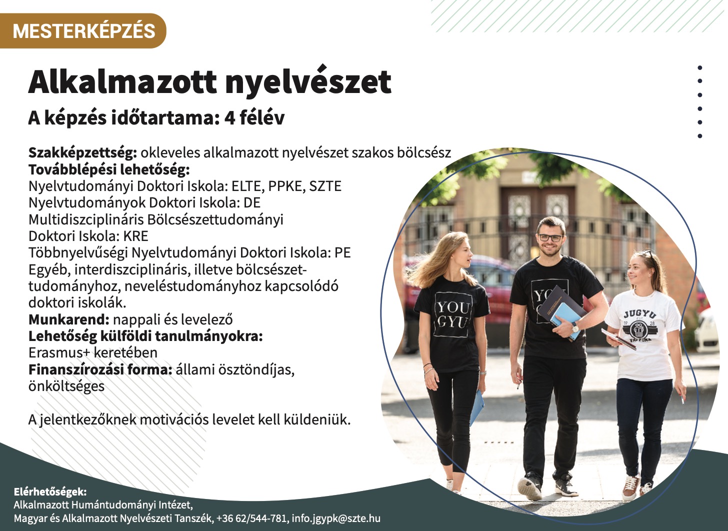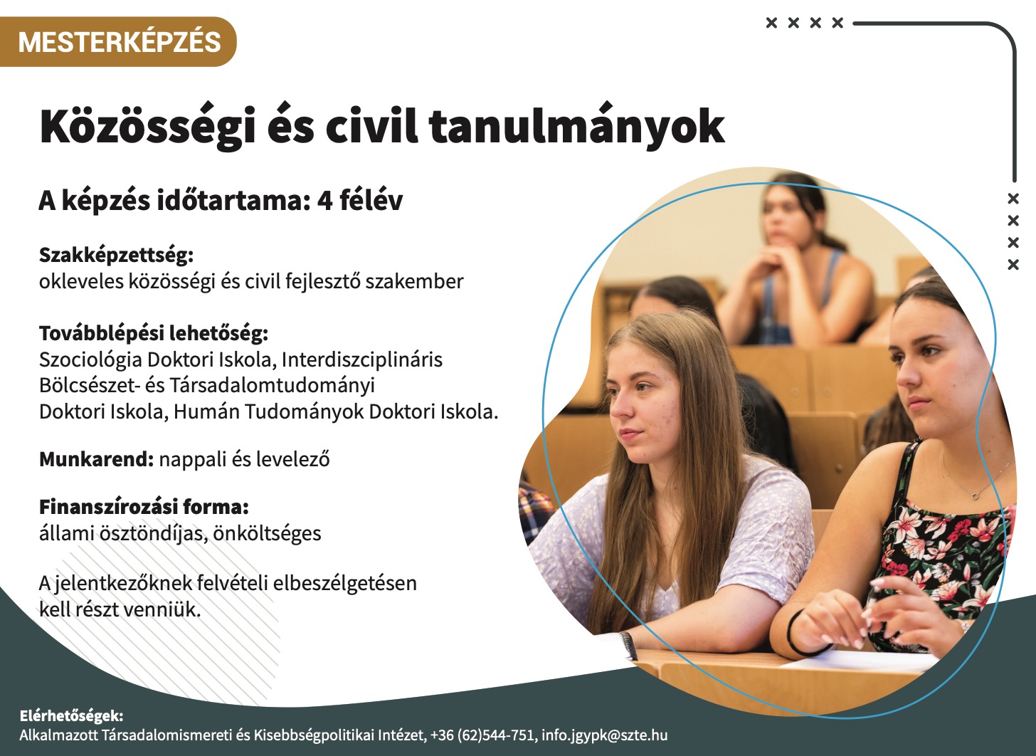 Az alábbi levelünkkel a Juhász Gyula Pedagógusképző Karon történő mesterszakos továbbtanulási lehetőségeidről szeretnénk tájékoztatni, hogy megkönnyítsük döntésedet a 2026. február 15.-ig tartó felvételi jelentkezés időszakára.