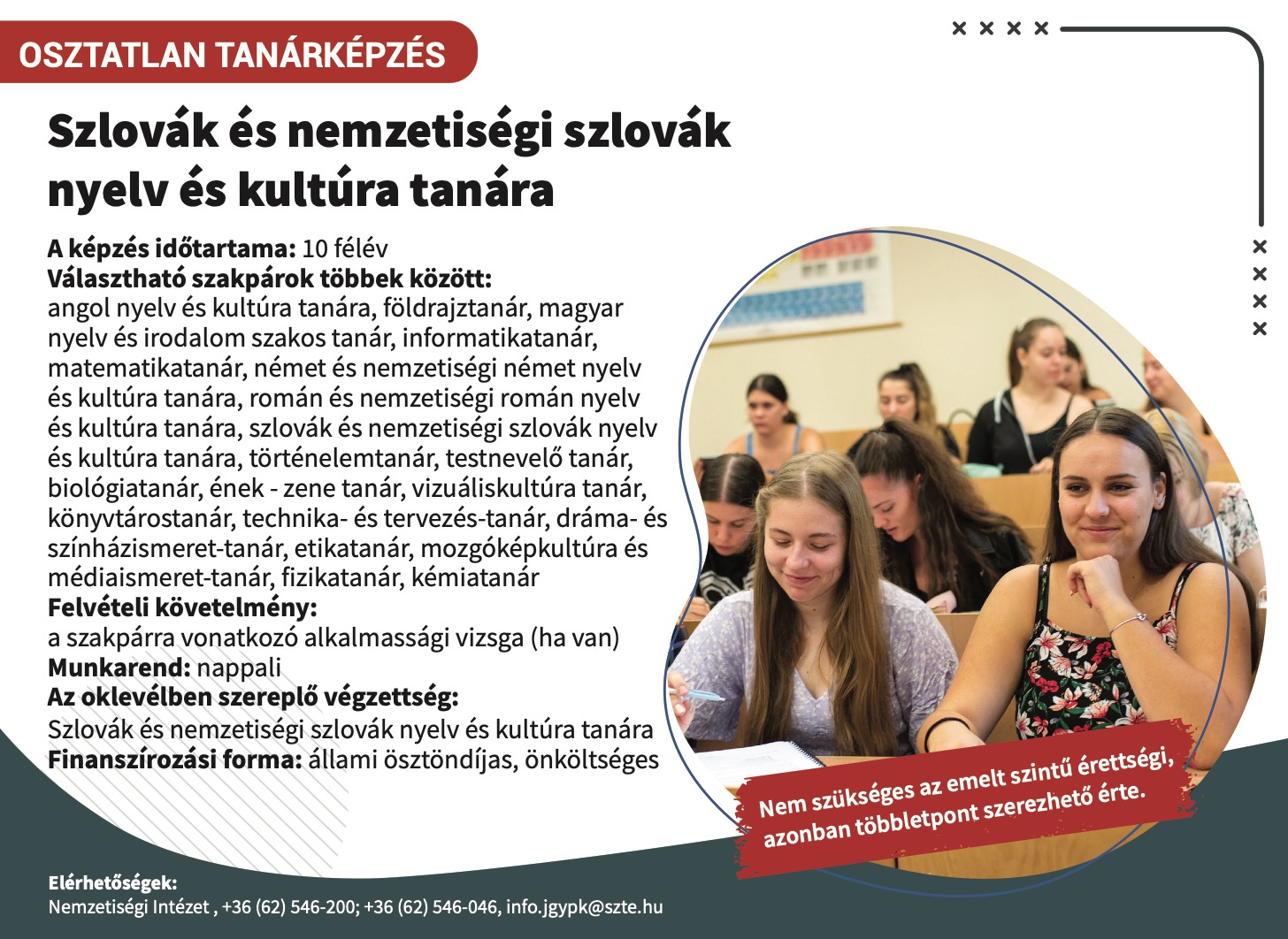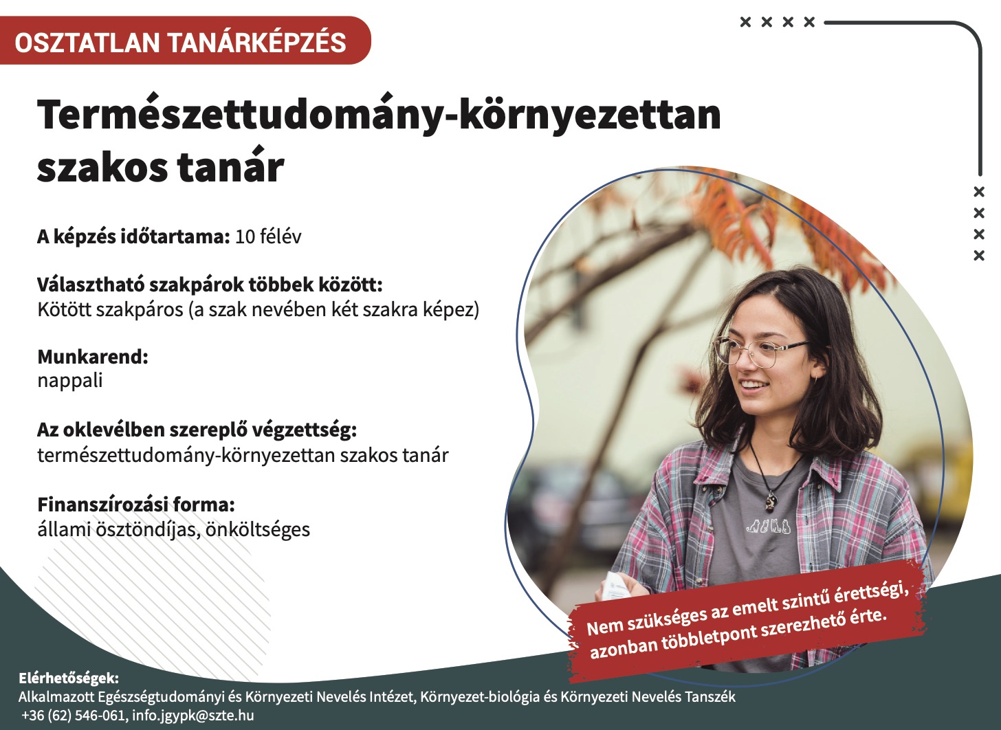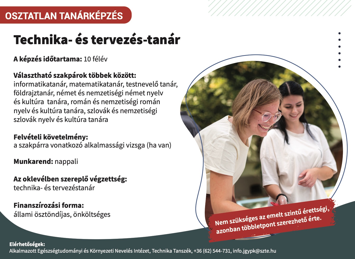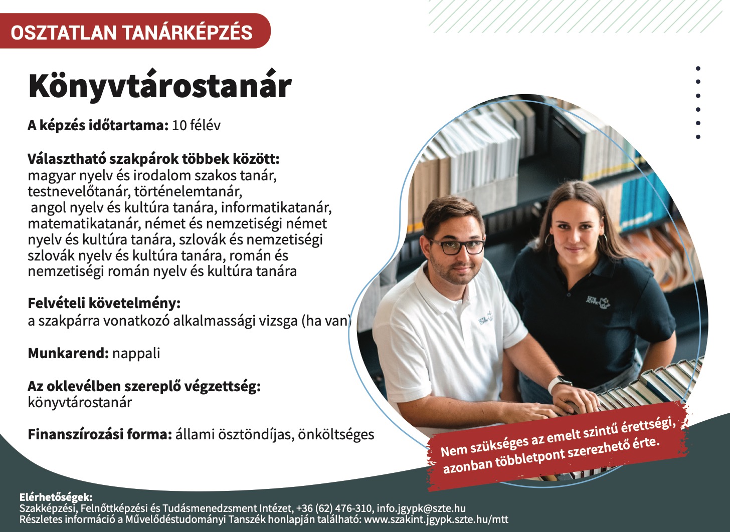 Az alábbi levelünkkel a Juhász Gyula Pedagógusképző Karon történő kétszakos osztatlan tanári, valamint egyszakos osztott részidős tanári mesterszakos továbbtanulási lehetőségeidről szeretnénk tájékoztatni, hogy megkönnyítsük döntésedet a 2026. február 15-ig tartó felvételi jelentkezés időszakára.