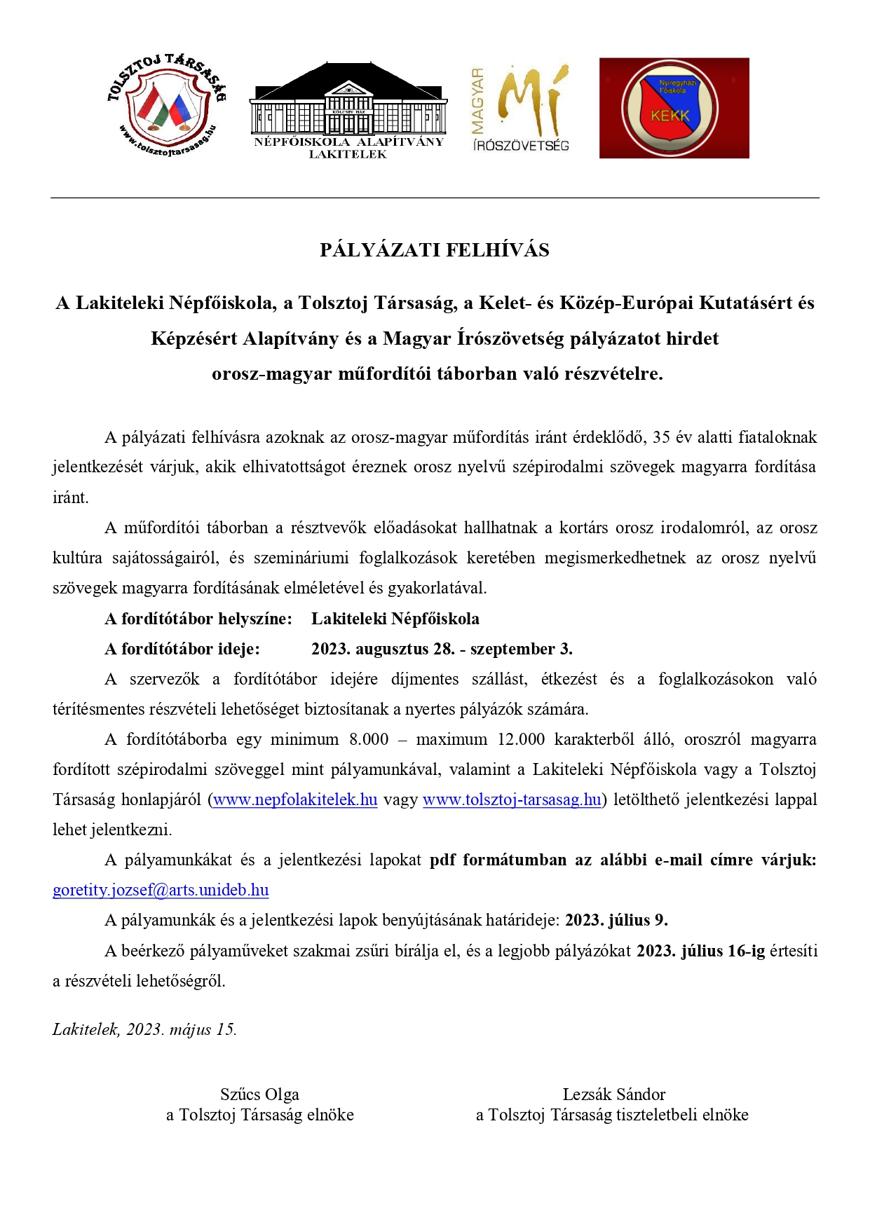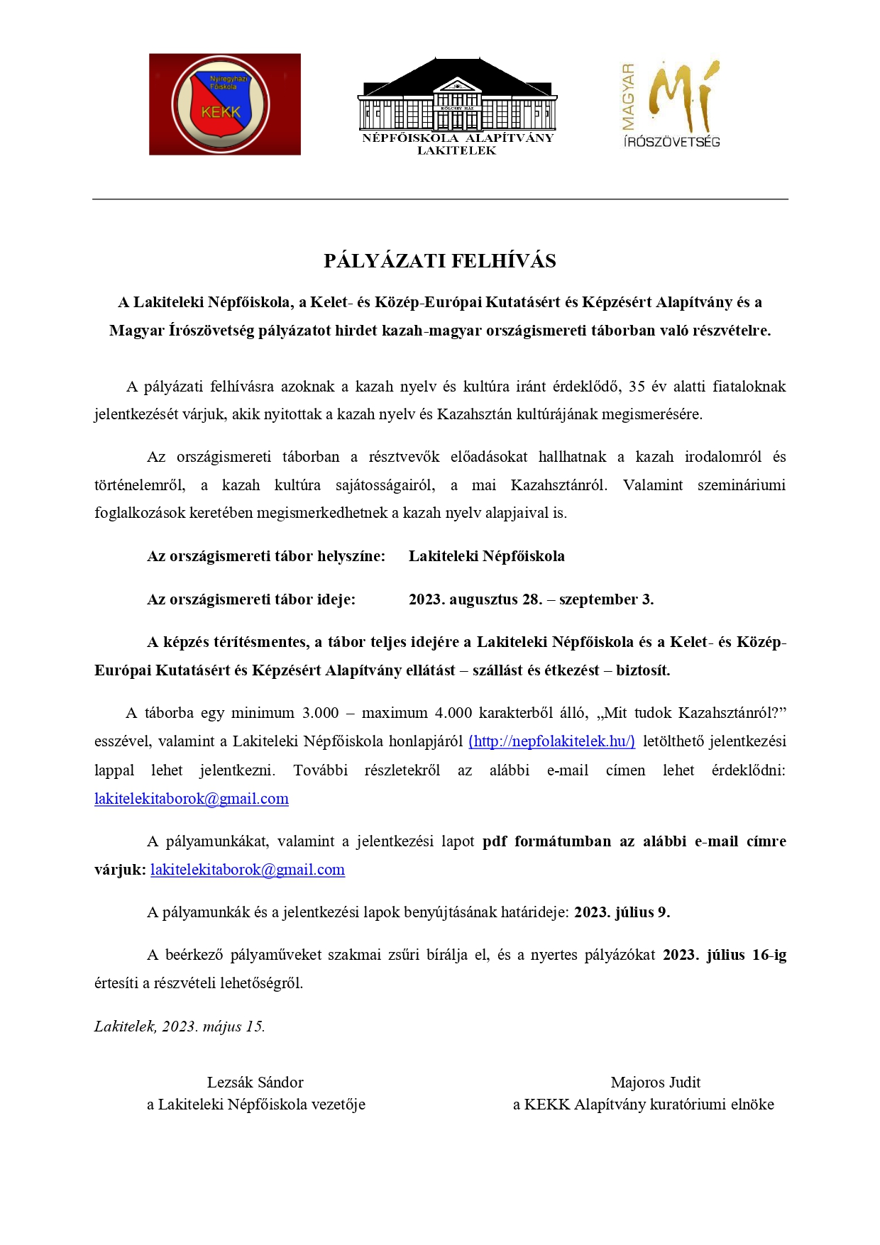 A Lakiteleki Népfőiskola, a Kelet- és Közép-Európai Kutatásért és Képzésért Alapítvány és a Magyar Írószövetség pályázatot hirdet kazah-magyar, koreai-magyar és mongol-magyar országismereti táborban, valamint orosz-magyar műfordítói táborban való részvételre.