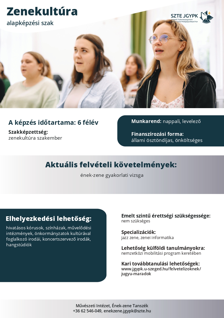 Specializációk: jazz zene, zenei informatikus, zenei popkultúra és kóruskultúra