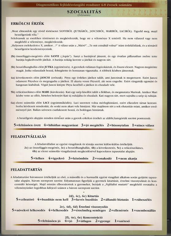 A vizsgálat egyéni formában történik. A szocialitást is mérjük, ezért figyeljük a kapcsolatfelvételt, feladatvállalást és kitartást, az érzelmi viszonyulást és a koncentrációt is. Egy erkölcsi érzéket fejlesztő mesével indítjuk a vizsgálatot. A szocialitás felsorolt összetevőinek értékelési szempontjait a Szocialitás feladatlapon láthatják.