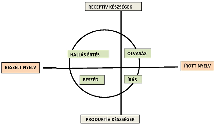 Az ábra (Meggyesné, szerk) szemléletesen mutatja, hogyan alakul a tanulásban akadályozott gyermekek idegennyelv-tanítása során a négy idegen nyelvi alapkészség fejlesztésének aránya. Elemezze az ábrát, keressen összefüggéseket!