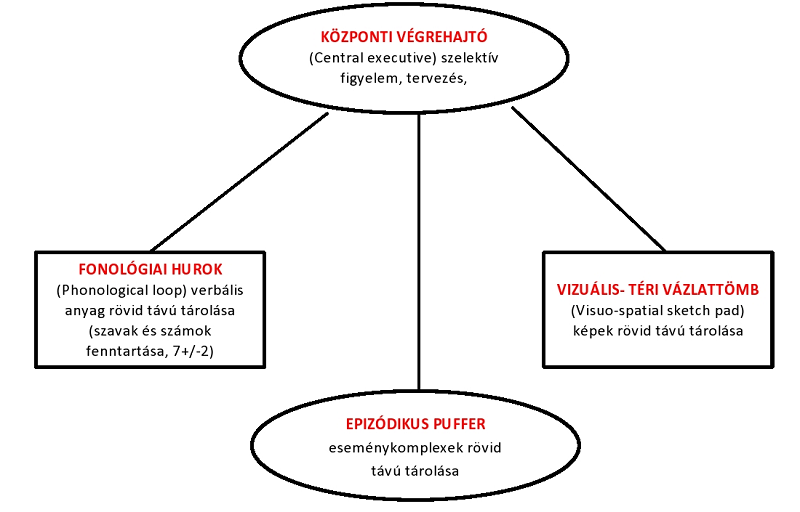 A munkamemória több egységet foglal magába. A központi végrehajtó irányítja a hozzá kapcsolódó alrendszereket. Az eredeti modellben a két alrendszer a fonológiai hurok, illetve a téri-vizuális vázlattömb volt, de a későbbiekben Baddeley (2000) hozzákapcsolt egy harmadik alrendszert is, az epizodikus tárat. Vizsgálatok bizonyítják, hogy a korábbi életkorban megfigyelt fonológiai hurok kapacitásbeli különbségek jól bejósolják a későbbi szókincsnövekedést. A fonológiai hurok jelentős szerepet játszik az új szavak tanulásában. A fonológiai hurok, azon belül a fonológiai tár egy nyelvtanuló „készülék” (Baddeley és mtsai 1998, Polonyi, Abari, Nótin, 2009)