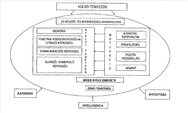 Polonyi és Mérő nyelvtanulókkal, kétnyelvűekkel és tolmácsokkal felvett kérdőívek alapján a nyelvtanulást meghatározó tényezőket három kategóriába sorolja: külső tényezők (1) (amelyek pozitív vagy negatív hatást gyakorolhatnak), motivációs és kognitív tényezők (2) (az ábrán az oválisban szereplő faktorok), személyiségjegyek és az intelligencia (3). Az elemző-, kombináló képesség, mint gyűjtőfogalom a grammatikai érzékenység, az induktív tanulási képesség, a logikai- és az asszociációs képességet takarja. (Polonyi, Mérő, 2007)