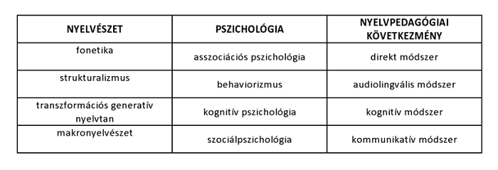 12 történeti nyelvtanítási módszert tart számon a szakirodalom, amelyek mindegyike megfelel a módszerkritériumnak, de egyes módszerek, tekintve a háttértudományokban fennálló összhangot, nyelvtanítási elméletté is nyilváníthatók, ahogy az ábra mutatja (Bárdos, 2005).