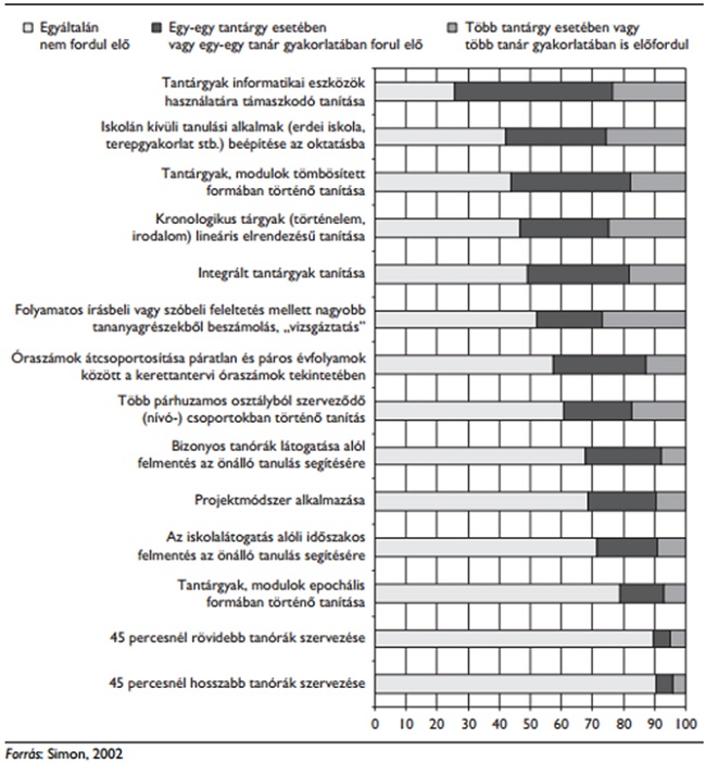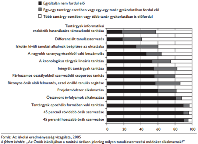 „A kutatások szerint fokozatos, de jelentős változások figyelhetők meg az iskolák tanulásszervezési tevékenységében” (Török, Szekszárdi és Mayer, 2011). Az alábbi ábrák a tananyag- és tanulásszervezési módok alakulását mutatják a hazai iskolai gyakorlatban, 2002 és 2005 között.