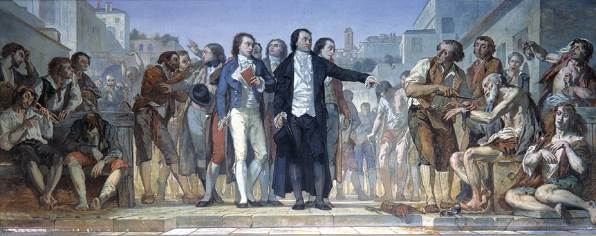 23. kép:Charles Luis Lucien Müller: Pinel elrendeli a láncok levételét a Bicêtre-ben (1849)