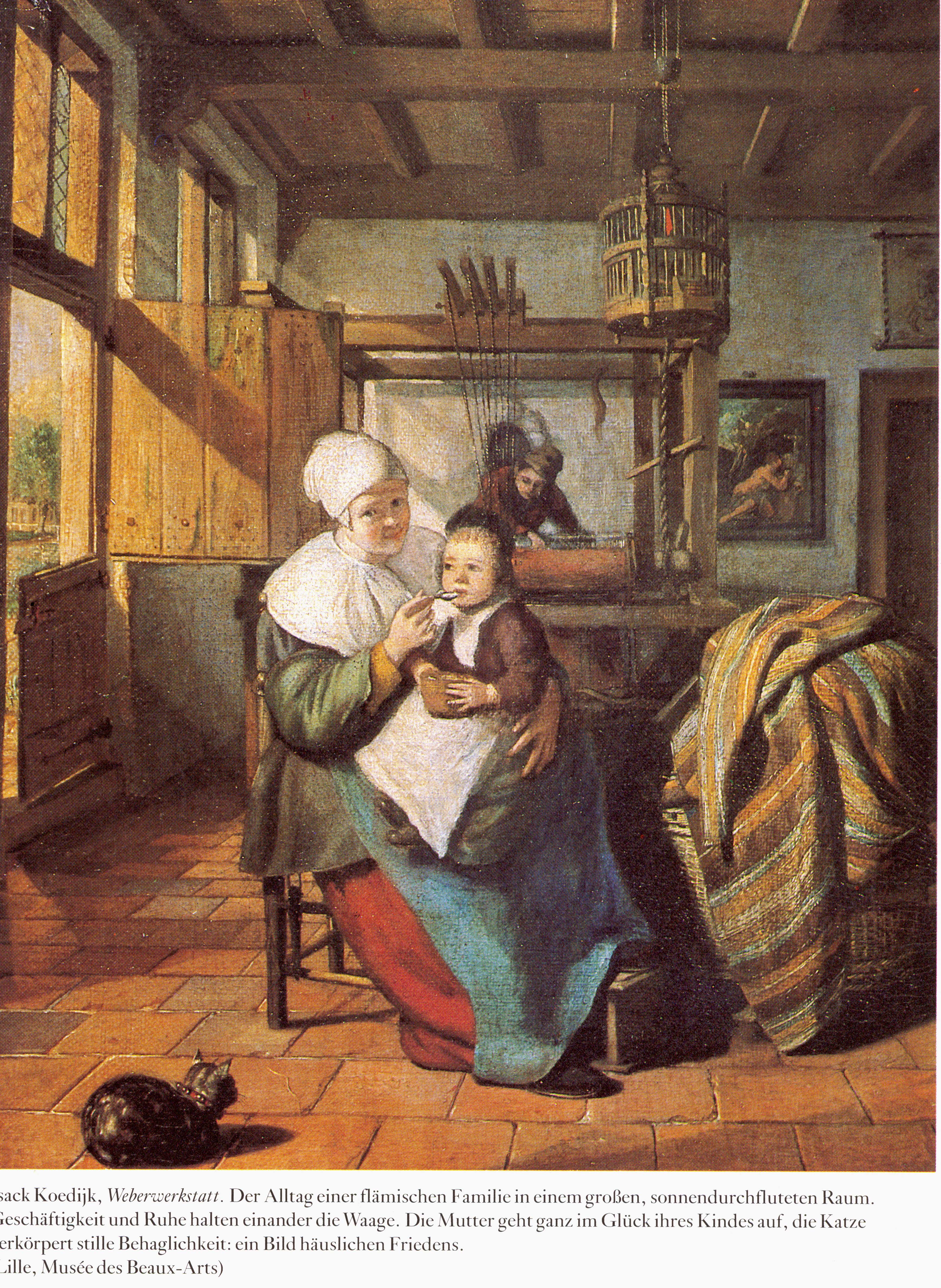 A flamand festők ekkor már szívesen örökítik meg a családi otthonok belső tereit, szívesen mutatják be a családi élet meghitt örömeit. Jó példa erre egy 17. században élő amsterdami festő, Isaak Koedijk (1616-1668) Takácsműhely című képe.