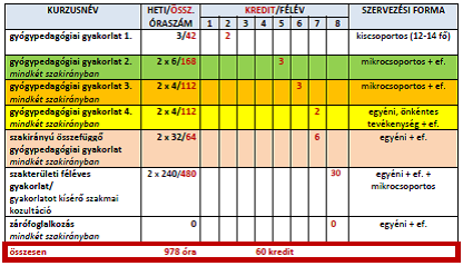 A szegedi képzés korábbi és aktuális mintatanterve jól illeszkedik a szak és a szakirányok hatályos képzési és kimeneti követelményeihez. Megfelel KKK-ban megfogalmazott előírásoknak, amely a gyakorlatokkal kapcsolatban így fogalmaz: „A szakmai gyakorlat részét képezik a szakirányhoz kapcsolódó hallgatói hospitálások, az egyéni és kiscsoportos gyakorlatok, az önismereti, kommunikációs, fejlesztő tréningek, a gyakorlatorientált stúdiumok keretében végzett gyakorlatok, továbbá az összefüggő szakmai gyakorlat.” (15/2006. (IV. 3.) OM rendelet. 2. sz. melléklet. X. fejezet 4. Gyógypedagógia alapképzési szak)
