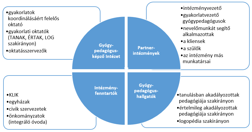 Amikor a kooperáció szereplőit vesszük számba, a Gyógypedagógus-képző Intézetet, gyakorlati oktatóit és oktatásszervezőit, a gyógypedagógus jelölteket és a gyakorlatuknak terepet biztosító partnerintézményeket említjük az ott dolgozó gyakorlatvezető gyógypedagógusokkal, akik a mentori feladatokat látják el. De közel sem lenne teljes a felsorolás, ha nem említenénk a partnerintézmények fenntartóit, belső és külső társadalmi környezetét, azaz a nevelőmunkát segítő és egyéb alkalmazottakat, a klienseket és a szülőket, az intézményeket támogató civil szervezeteket, stb.