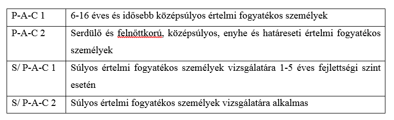 A P-A-C Günzburg nevéhez köthető, ez olyan módszer, ami különböző súlyosságú értelmi fogyatékos személyek szociális kompetenciájának egyes területeit méri fel, így képes meghatározni a fejlesztés irányait is. A P-A-C módszerének több változata ismert, melyeket a 11.1. táblázatban ismertetünk.