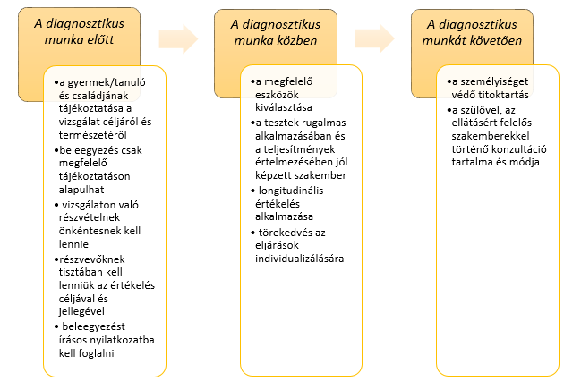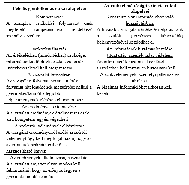 A diagnosztikus munka során betartandó etikai elvek kapcsán két csoportosítást említ a Diagnosztikai kézikönyv erre vonatkozó fejezete (Nagyné és Mészáros, 2012). Egyrészt a felelős gondolkodás és az emberi méltóság tisztelete elvei alapján ismertetik az etikai elvárásokat (Krueger és McLeod, 1994, idézi Nagyné és Mészáros, 2012), másrészt pedig a vizsgálat folyamatának etikai elveit mutatják be (Rae, 2001, idézi Nagyné és Mészáros, 2012). Ezeket az ismertetett elveket a 2. sz. táblázatban és a 2. sz. ábrán szemléltetjük. Jelen munka 2. sz. táblázatban csak az etikai alapelvekre térünk ki, a teljesítendő elvárások részletes leírását Nagyné és Mészáros (2012) ismerteti.