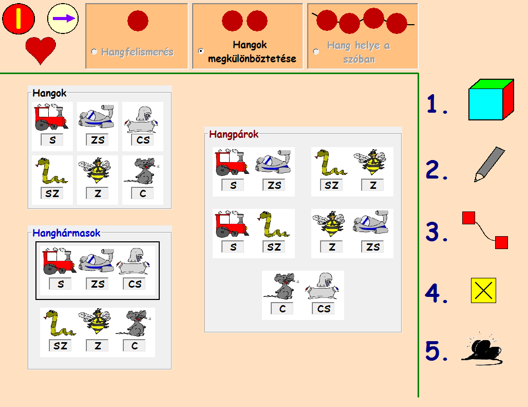 A program a fonológiai tudatosság fejlesztésre alkalmas, az sz, z, c, s, zs, cs hangok hallási differenciálását segíti. (lásd: 6. sz. kép) A hangfelismerésnél a gyermek feladata, hogy eldöntse, hogy az adott hang szerepel-e a szóban, meghatározza a hang fonetikai helyzetét, valamint a hangpárok, hanghármasok választása esetén a különböző hangok differenciálását. A program innovatív jellege, hogy a gyermek önállóan gyakorolhat. A feladat teljesítését követően a szoftver ellenőrzi a munkát, így működik az azonnali a visszacsatolás, lehetőséget nyújtva a javításra. (Szili és Illésiné, 2013) A program elérhető a GyITE honlapjáról, azonban kompatilbilítási problémák miatt csak régebbi Windows operációs rendszerek alatt fut megfelelően.