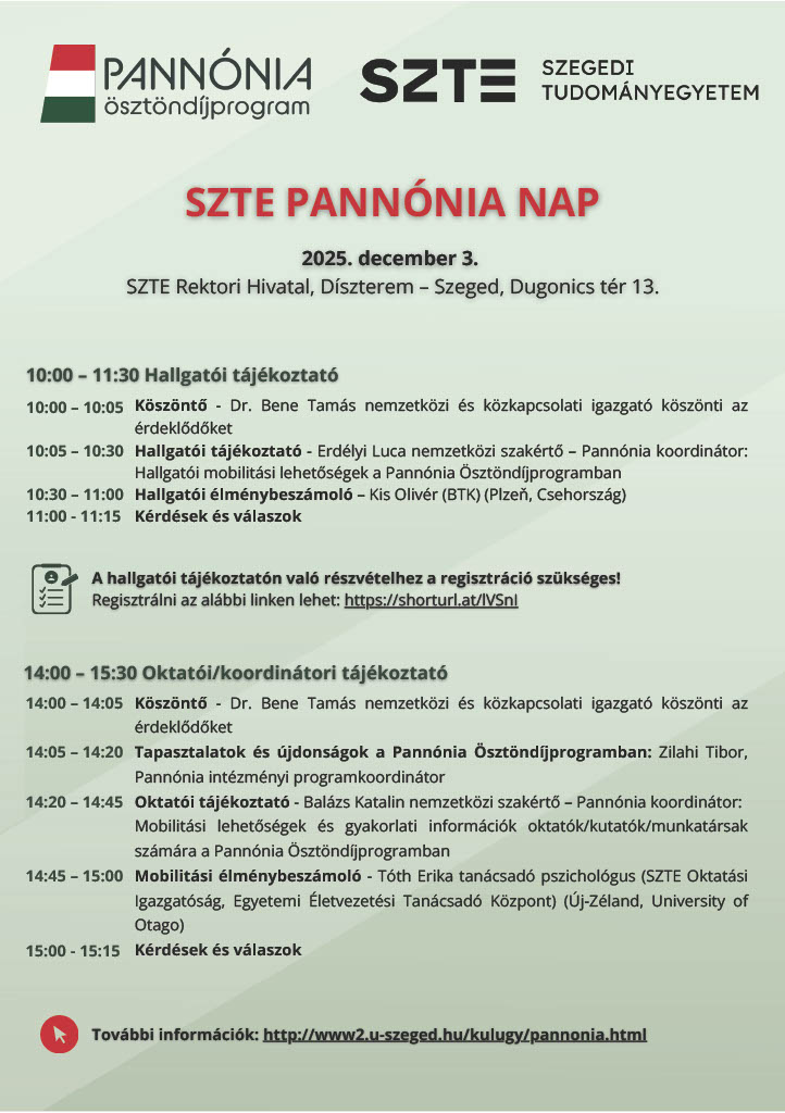 SZTE Nemzetközi Mobilitási Iroda (NMI) 2025. december 3-án, 10 órai kezdettel a Pannónia Ösztöndíjprogrammal kapcsolatos tájékoztatót szervez egyetemi polgároknak a Rektori Hivatal Dísztermében.